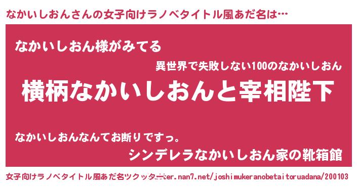 | 男性向けラノベタイトル風あだ名 | 『なかいしおんに滅ぼされるだけの簡単なお仕事です』 |