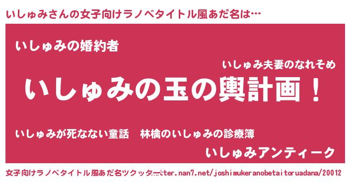 | 男性向けラノベタイトル風あだ名 | 『いしゅみ~年齢イコール彼女いない歴の魔法使い~』 |