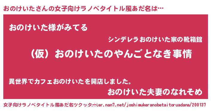 | 男性向けラノベタイトル風あだ名 | 『おのけいたの憂鬱』 |