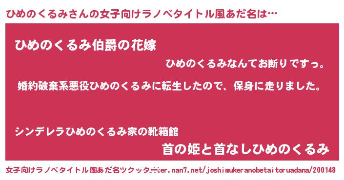 | 男性向けラノベタイトル風あだ名 | 『転生したらひめのくるみだった件』 |