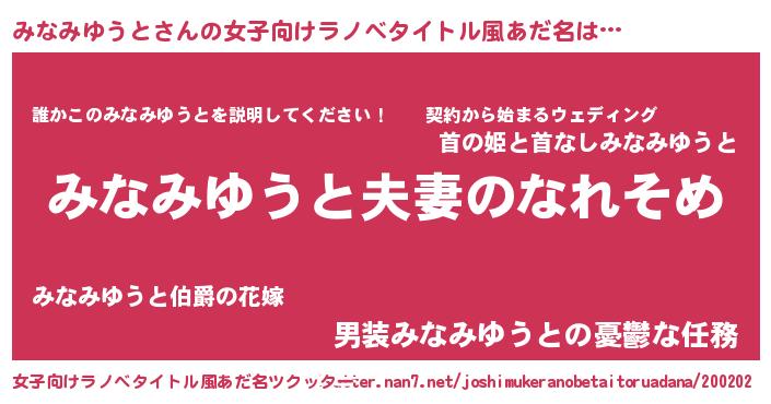 | 男性向けラノベタイトル風あだ名 | 『おまえをオタクにしてやるから、俺をみなみゆうとにしてくれ! 』 |