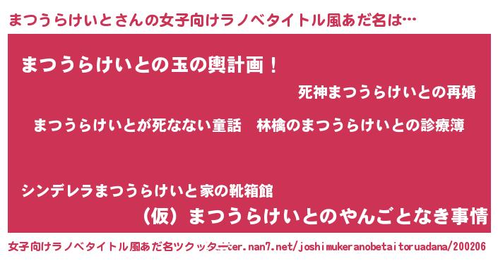 | 意味不明あだ名 | 『住所不定無職まつうらけいと(9歳)』 |