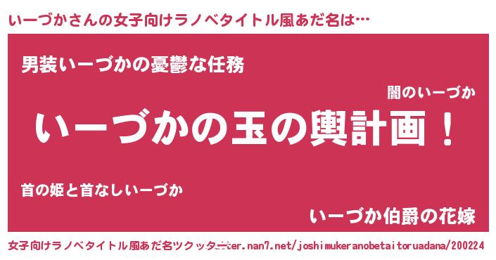 | 男性向けラノベタイトル風あだ名 | 『いーづか~年齢イコール彼女いない歴の魔法使い~』 |