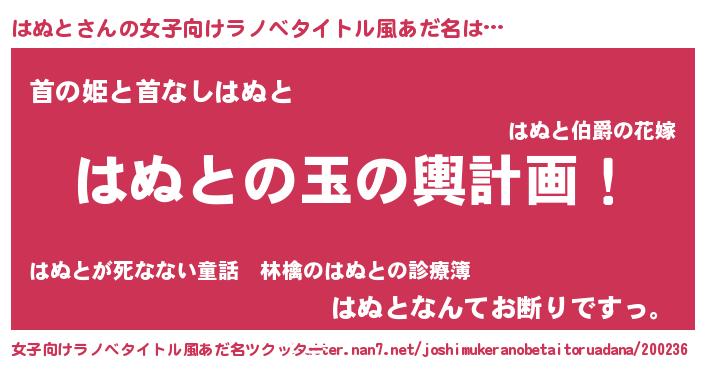 | 男性向けラノベタイトル風あだ名 | 『転生したらはぬとだった件』 |