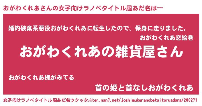 | 男性向けラノベタイトル風あだ名 | 『やはりおがわくれあの青春ラブコメはまちがっている 』 |