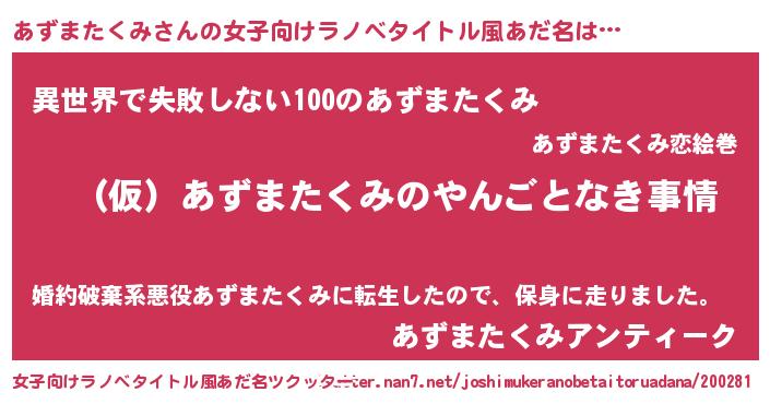 | 胡散臭い通販商品みたいなあだ名 | 『必ず成功するブレスレット…その名も「あずまたくみ」』 |