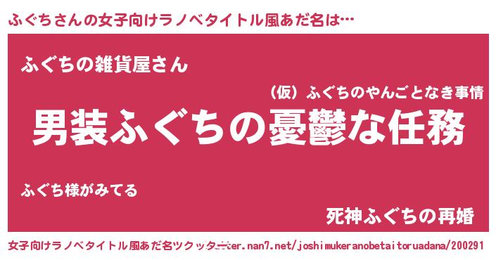 | 男性向けラノベタイトル風あだ名 | 『うちのふぐちが世界を掌握している!』 |