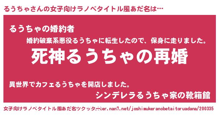 るうちゃさんの女子向けラノベタイトル風あだ名は… 『死神るうちゃの再婚』『るうちゃの婚約者』『シンデレラるうちゃ家の靴箱館』 ツクッター #女子向けラノベタイトル風あだ名ツクッター http://tkutter.nan7.net/joshimukeranobetaitoruadana/200335/
