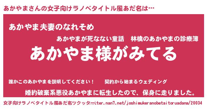 | 男性向けラノベタイトル風あだ名 | 『あかやまの嫁は女の子じゃないと思った?』 |