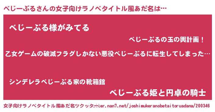 | 男性向けラノベタイトル風あだ名 | 『魔弾の王とべじーぶる』 |