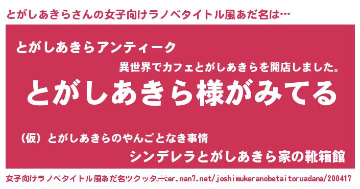 | 男性向けラノベタイトル風あだ名 | 『とがしあきらの嫁は女の子じゃないと思った?』 |