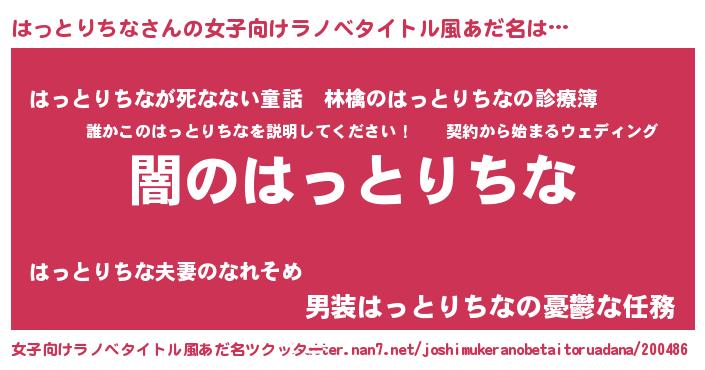 はっとりちなさんの女子向けラノベタイトル風あだ名は… 『闇のはっとりちな』『はっとりちなが死なない童話 林檎のはっとりちなの診療簿』『男装はっとりちなの憂鬱な任務』 ツクッター #女子向けラノベタイトル風あだ名ツクッター http://tkutter.nan7.net/joshimukeranobetaitoruadana/200486/