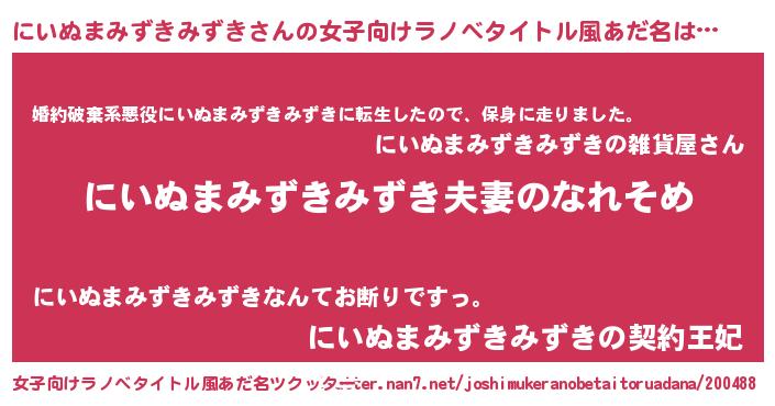 | 男性向けラノベタイトル風あだ名 | 『おまえをオタクにしてやるから、俺をにいぬまみずきみずきにしてくれ! 』 |
