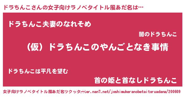 | 男性向けラノベタイトル風あだ名 | 『ドラちんこの憂鬱』 |