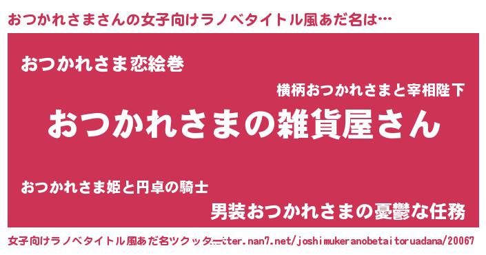 | 男性向けラノベタイトル風あだ名 | 『やはりおつかれさまの青春ラブコメはまちがっている 』 |