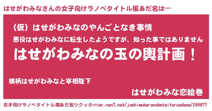 | 男性向けラノベタイトル風あだ名 | 『転生したらはせがわみなだった件』 |