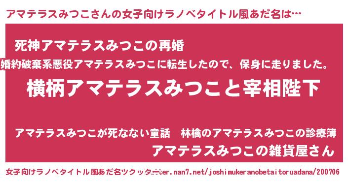 | 男性向けラノベタイトル風あだ名 | 『アマテラスみつこに滅ぼされるだけの簡単なお仕事です』 |