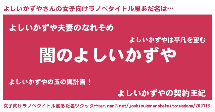 よしいかずやさんの女子向けラノベタイトル風あだ名は… 『闇のよしいかずや』『よしいかずや夫妻のなれそめ』『よしいかずやの契約王妃』 ツクッター #女子向けラノベタイトル風あだ名ツクッター http://tkutter.nan7.net/joshimukeranobetaitoruadana/200716/