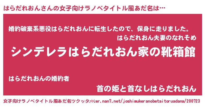 はらだれおんさんの女子向けラノベタイトル風あだ名は… 『シンデレラはらだれおん家の靴箱館』『婚約破棄系悪役はらだれおんに転生したので、保身に走りました。』『首の姫と首なしはらだれおん』 ツクッター #女子向けラノベタイトル風あだ名ツクッター http://tkutter.nan7.net/joshimukeranobetaitoruadana/200723/