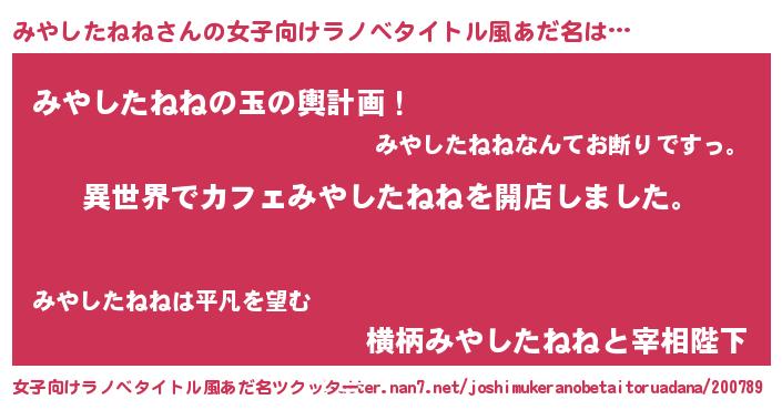 | 胡散臭い通販商品みたいなあだ名 | 『前代未聞の健康食品…その名も「みやしたねね」』 |