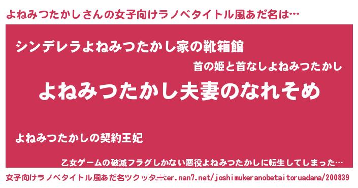 | 男性向けラノベタイトル風あだ名 | 『おまえをオタクにしてやるから、俺をよねみつたかしにしてくれ! 』 |