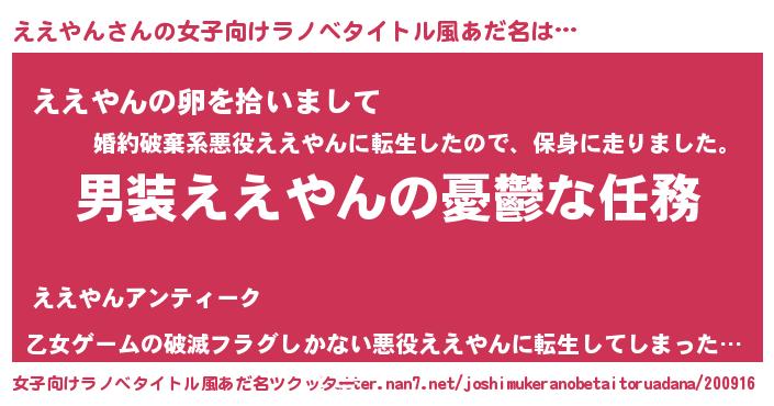 | 男性向けラノベタイトル風あだ名 | 『うちのええやんが世界を掌握している!』 |