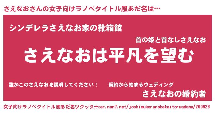 さえなおさんの女子向けラノベタイトル風あだ名は… 『さえなおは平凡を望む』『シンデレラさえなお家の靴箱館』『さえなおの婚約者』 ツクッター #女子向けラノベタイトル風あだ名ツクッター http://tkutter.nan7.net/joshimukeranobetaitoruadana/200926/