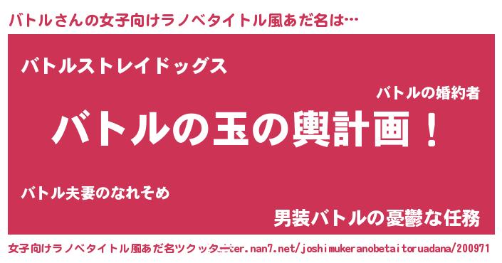 | 男性向けラノベタイトル風あだ名 | 『バトル~年齢イコール彼女いない歴の魔法使い~』 |