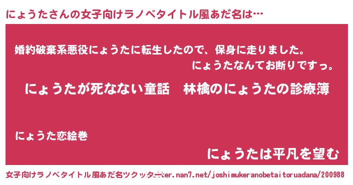 | 男性向けラノベタイトル風あだ名 | 『魔弾の王とにょうた』 |