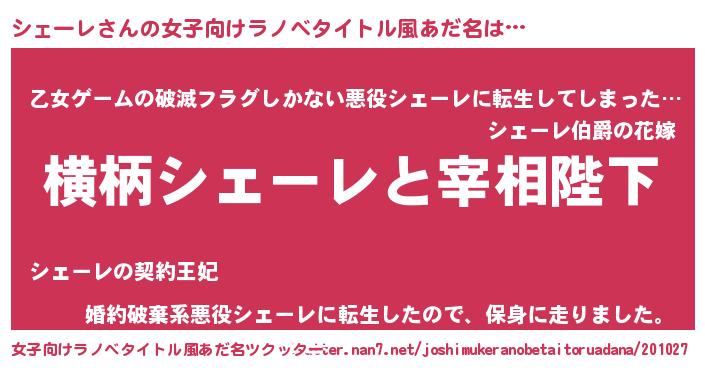 | 男性向けラノベタイトル風あだ名 | 『シェーレに滅ぼされるだけの簡単なお仕事です』 |