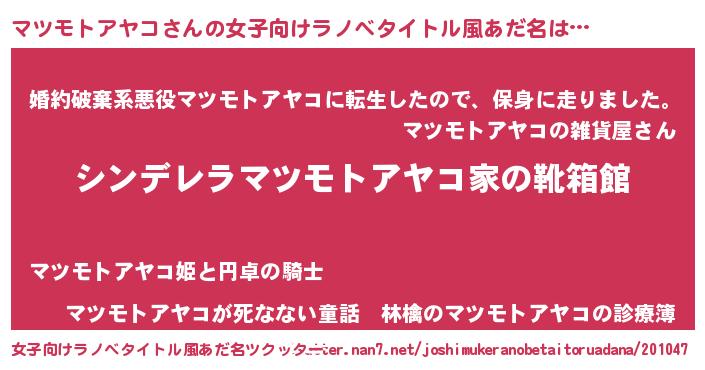 | 胡散臭い通販商品みたいなあだ名 | 『ハリウッド女優が絶賛した100年もののヴィンテージワイン…その名も「マツモトアヤコ」』 |