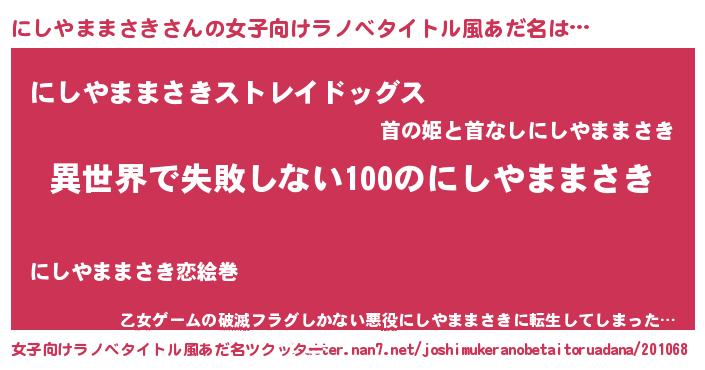 | 男性向けラノベタイトル風あだ名 | 『にしやままさきという概念が存在しない退屈な世界 』 |