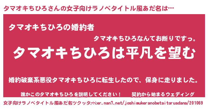 タマオキちひろさんの女子向けラノベタイトル風あだ名は… 『タマオキちひろは平凡を望む』『タマオキちひろの婚約者』『誰かこのタマオキちひろを説明してください! ~契約から始まるウェディング~』 ツクッター #女子向けラノベタイトル風あだ名ツクッター http://tkutter.nan7.net/joshimukeranobetaitoruadana/201069/