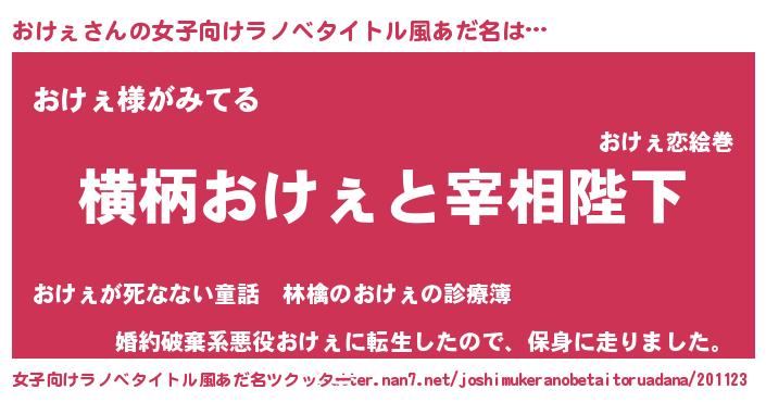 | 男性向けラノベタイトル風あだ名 | 『おけぇに滅ぼされるだけの簡単なお仕事です』 |