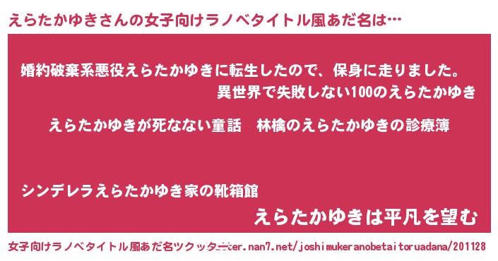 | 男性向けラノベタイトル風あだ名 | 『魔弾の王とえらたかゆき』 |
