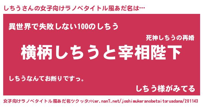 | 男性向けラノベタイトル風あだ名 | 『しちうに滅ぼされるだけの簡単なお仕事です』 |