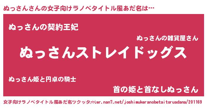 | 男性向けラノベタイトル風あだ名 | 『Re:ぬっさんから始める異世界生活』 |