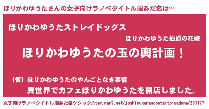 | 男性向けラノベタイトル風あだ名 | 『ほりかわゆうた~年齢イコール彼女いない歴の魔法使い~』 |