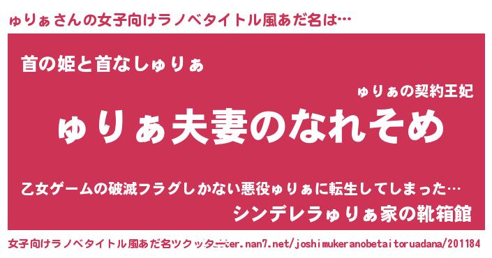 | 男性向けラノベタイトル風あだ名 | 『おまえをオタクにしてやるから、俺をゅりぁにしてくれ! 』 |