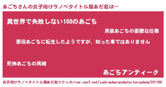 | 男性向けラノベタイトル風あだ名 | 『この素晴らしい世界にあごちを!』 |