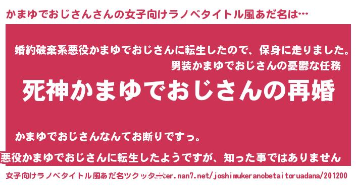 | 男性向けラノベタイトル風あだ名 | 『ノーゲーム・ノーカマユデオジサン』 |