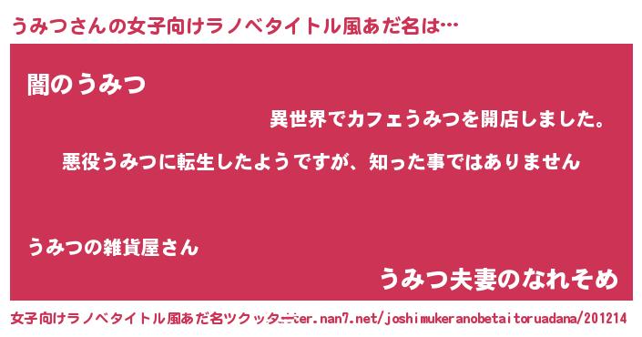 | 胡散臭い通販商品みたいなあだ名 | 『あなたにだけ特別に提供する限定10本のレアな日本酒…その名も「うみつ」』 |