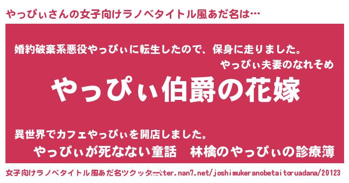 | 男性向けラノベタイトル風あだ名 | 『うちの娘の為ならば、俺はもしかしたらやっぴぃも倒せるかもしれない。』 |
