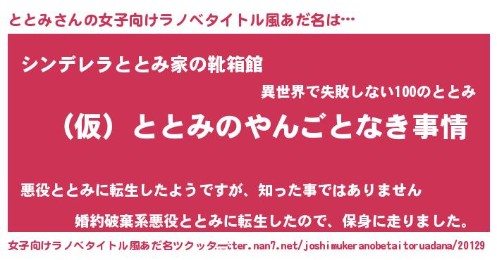 | 男性向けラノベタイトル風あだ名 | 『ととみの憂鬱』『トトミスレイヤー』 |