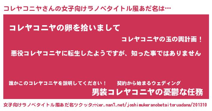 | 男性向けラノベタイトル風あだ名 | 『この素晴らしい世界にコレヤコニヤを!』 |