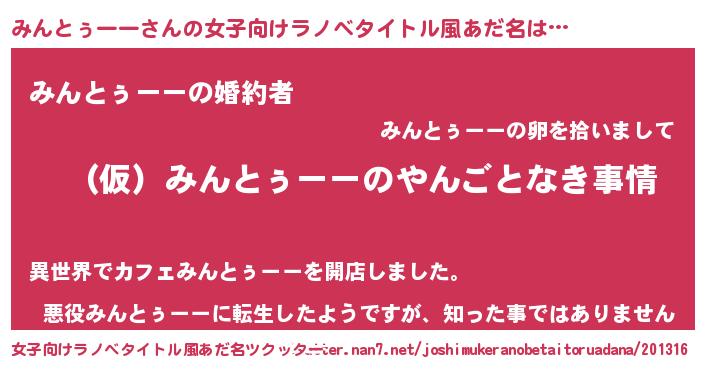 | 男性向けラノベタイトル風あだ名 | 『みんとぅーーの憂鬱』 |