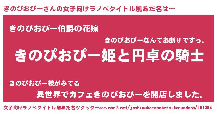 | 男性向けラノベタイトル風あだ名 | 『きのぴおぴーの憂鬱』 |
