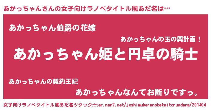 | 男性向けラノベタイトル風あだ名 | 『アカッチャンアートオンライン』 |