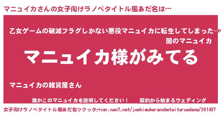 マニュイカさんの女子向けラノベタイトル風あだ名は… 『マニュイカ様がみてる』『乙女ゲームの破滅フラグしかない悪役マニュイカに転生してしまった…』『誰かこのマニュイカを説明してください! ~契約から始まるウェディング~』 ツクッター #女子向けラノベタイトル風あだ名ツクッター http://tkutter.nan7.net/joshimukeranobetaitoruadana/201437/