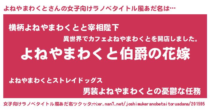 | 男性向けラノベタイトル風あだ名 | 『うちの娘の為ならば、俺はもしかしたらよねやまわくとも倒せるかもしれない。』 |